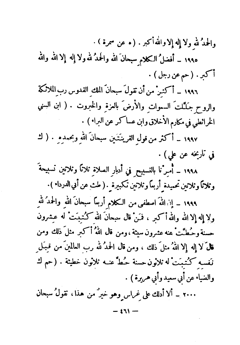 1998 – "أمرنا بالتسبيح في أدبار الصلاة ثلاثا وثلاثين تسبيحة وثلاثا وثلاثين تحميدة أربعا وثلاثين تكبيرة". (طث عن أبي الدرداء) .