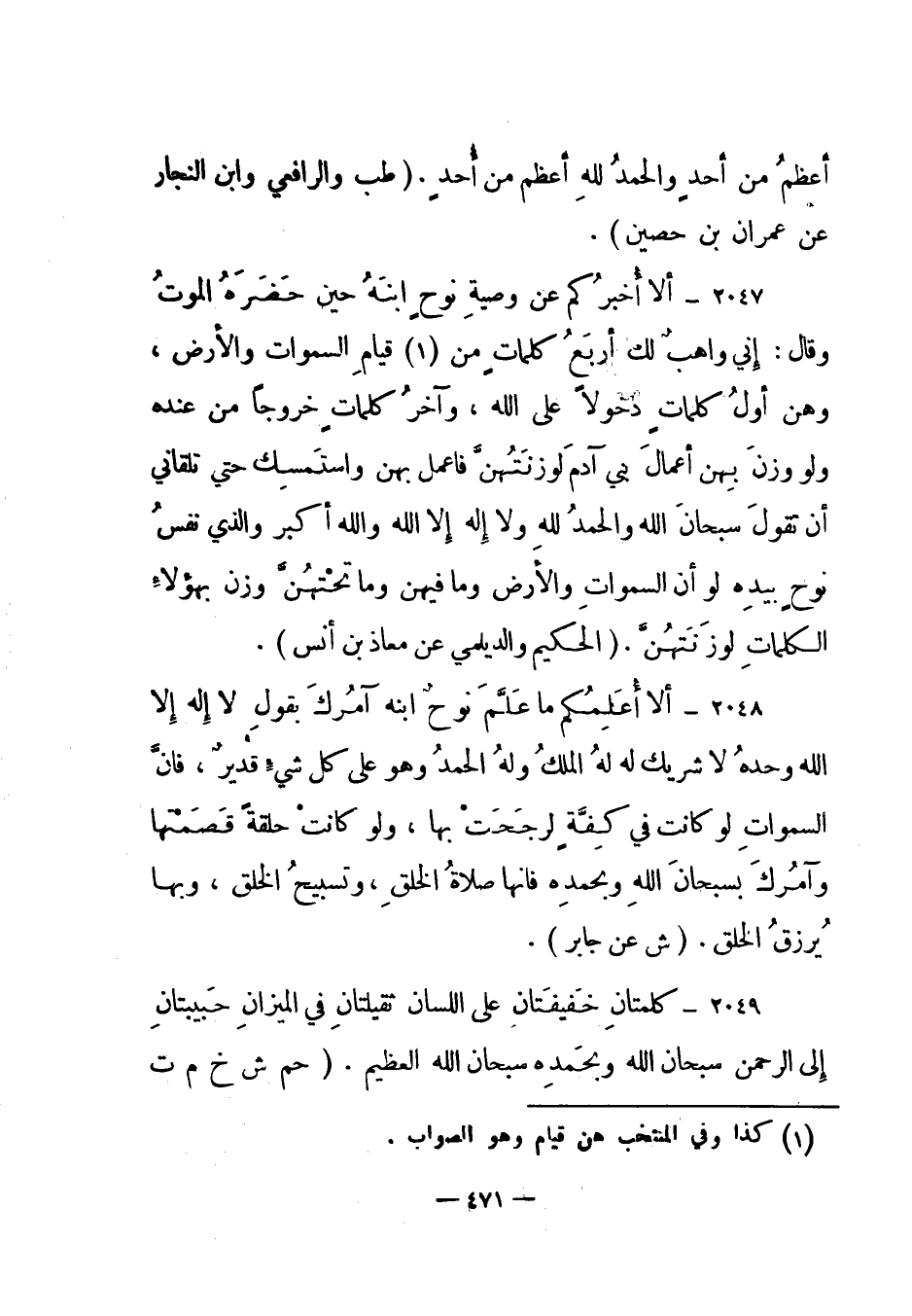 2047 – "ألا أخبركم عن وصية نوح ابنه حين حضره الموت وقال: إني واهب لك أربع كلمات من (1) قيام السموات والأرض، وهن أول كلمات دخولا على الله، وآخر كلمات خروجا من عنده ولو وزن بهن أعمال بني آدم لوزنتهن فاعمل بهن واستمسك حتى تلقاني أن تقول سبحان الله والحمد لله ولا إله إلا الله والله أكبر والذي نفس نوح بيده لو أن السموات والأرض وما فيهن وما تحتهن وزن بهؤلاء الكلمات لوزنتهن". (الحكيم والديلمي عن معاذ بن أنس) .