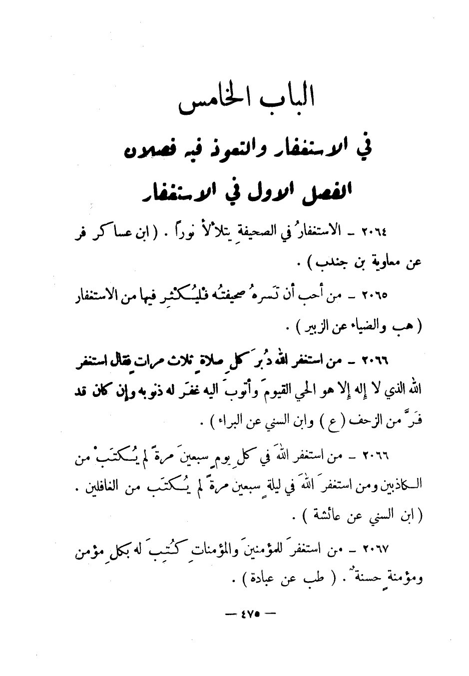 2066 - " من استغفر الله في كل يوم سبعين مرة لم يكتب من الكاذبين ومن استغفر الله في ليلة سبعين مرة لم يكتب من الغافلين". (ابن السني عن عائشة) .
