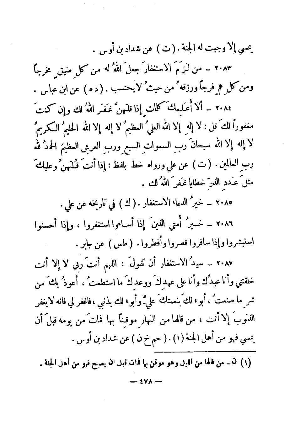 2087 – "سيد الاستغفار أن تقول: اللهم أنت ربي لا إله إلا أنت خلقتني وأنا عبدك وأنا على عهدك ووعدك ما استطعت، أعوذ بك من شر ما صنعت، أبوء لك بنعمتك علي - وأبوء لك بذنبي، فاغفر لي فإنه لا يغفر الذنوب إلا أنت، من قالها من النهار موقنا بها فمات من يومه قبل أن يمسي فهو من أهل الجنة" (1) . (حم خ ن) عن شداد بن أوس.