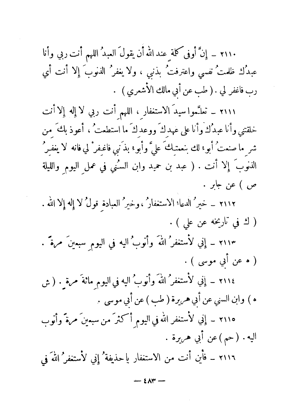 2111 – "تعلموا سيد الاستغفار، اللهم أنت ربي لا إله إلا أنت خلقتني وأنا عبدك وأنا على عهدك ووعدك ما استطعت، أعوذ بك من شر ما صنعت أبوء لك بنعمتك علي وأبوء بذنبي فاغفر لي فإنه لا يغفر الذنوب إلا أنت". (عبد بن حميد وابن السني في عمل اليوم والليلة ص) عن جابر.