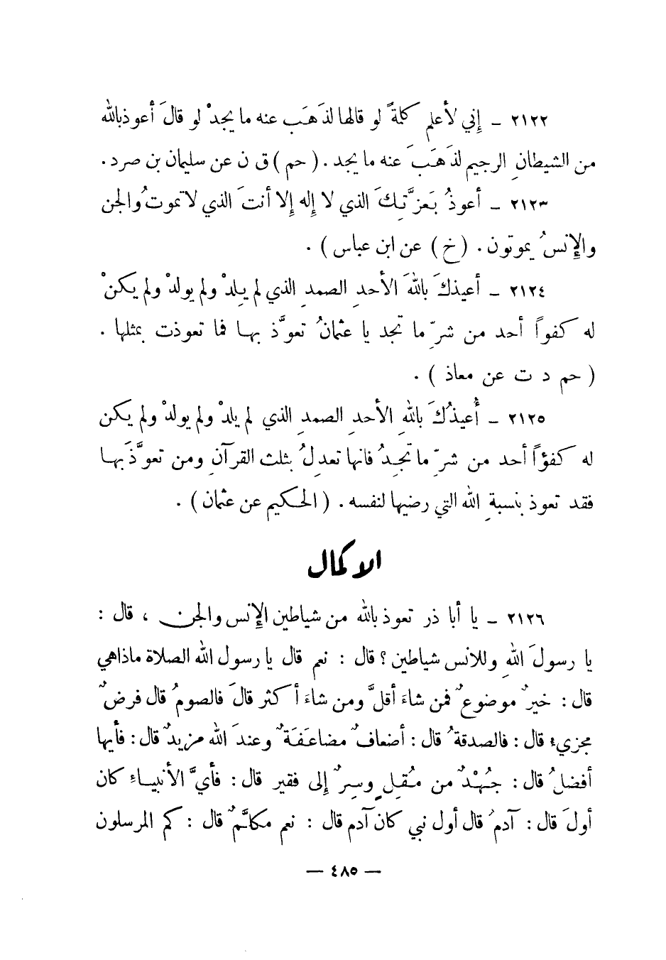 2125 – "أعيذك بالله الأحد الصمد الذي لم يلد ولم يولد ولم يكن له كفؤا أحد من شر ما تجد فإنها تعدل بثلث القرآن ومن تعوذ بها فقد تعوذ بنسبة الله التي رضيها لنفسه". (الحكيم عن عثمان) .