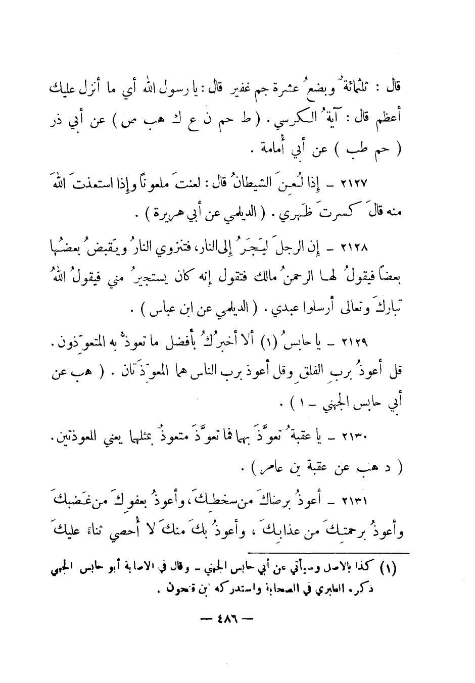 2129 – " يا حابس (1) ألا أخبرك بأفضل ما تعوذ به المتعوذون. قل أعوذ برب الفلق وقل أعوذ برب الناس هما المعوذتان". (هب عن أبي حابس الجهني) .