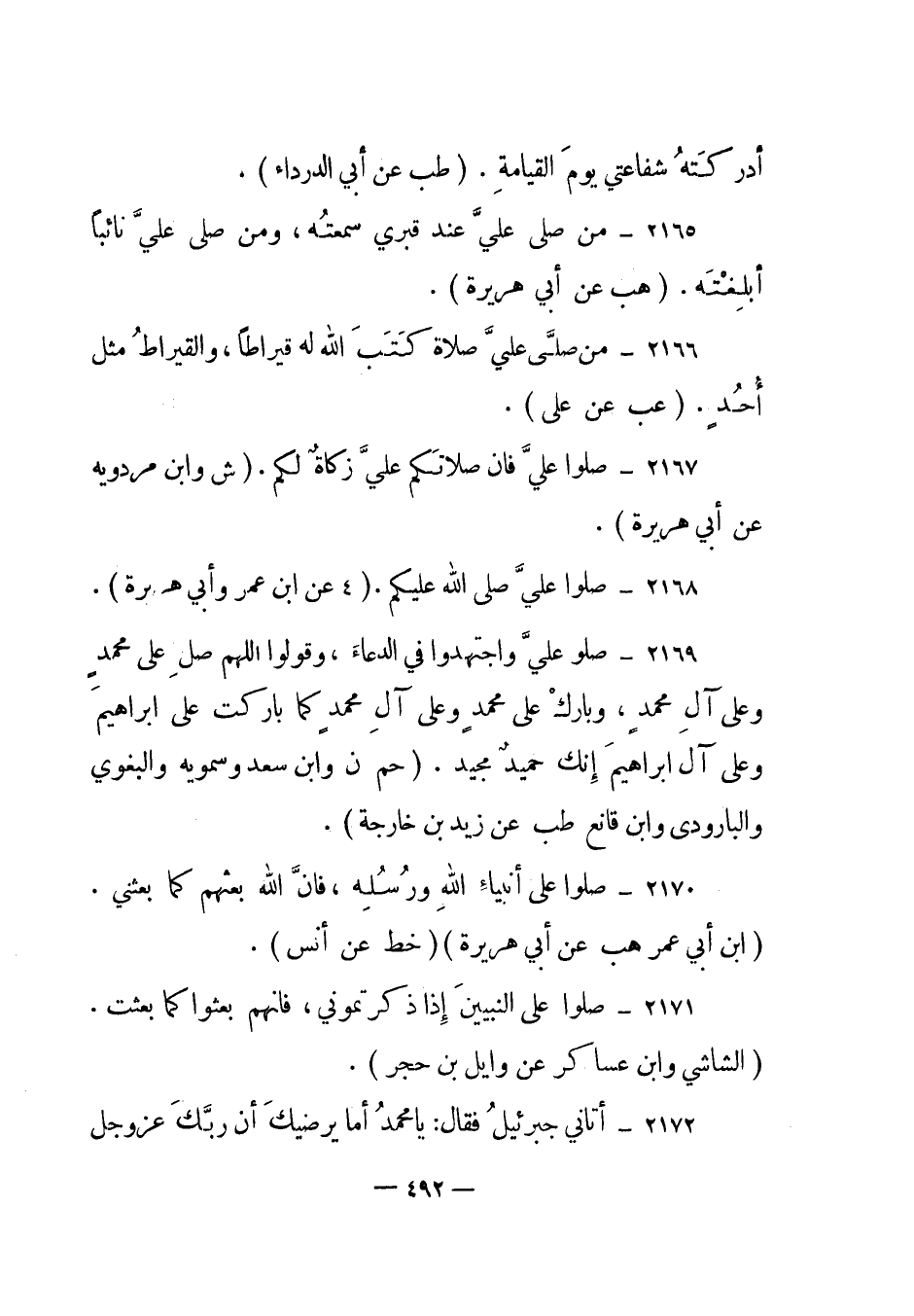 2169 – "صلوا علي واجتهدوا في الدعاء، وقولوا اللهم صل على محمد وعلى آل محمد، وبارك على محمد وعلى آل محمد كما باركت على إبراهيم وعلى آل إبراهيم إنك حميد مجيد". (حم ن وابن سعد وسمويه والبغوي والبارودي وابن قانع طب عن زيد بن خارجة) .