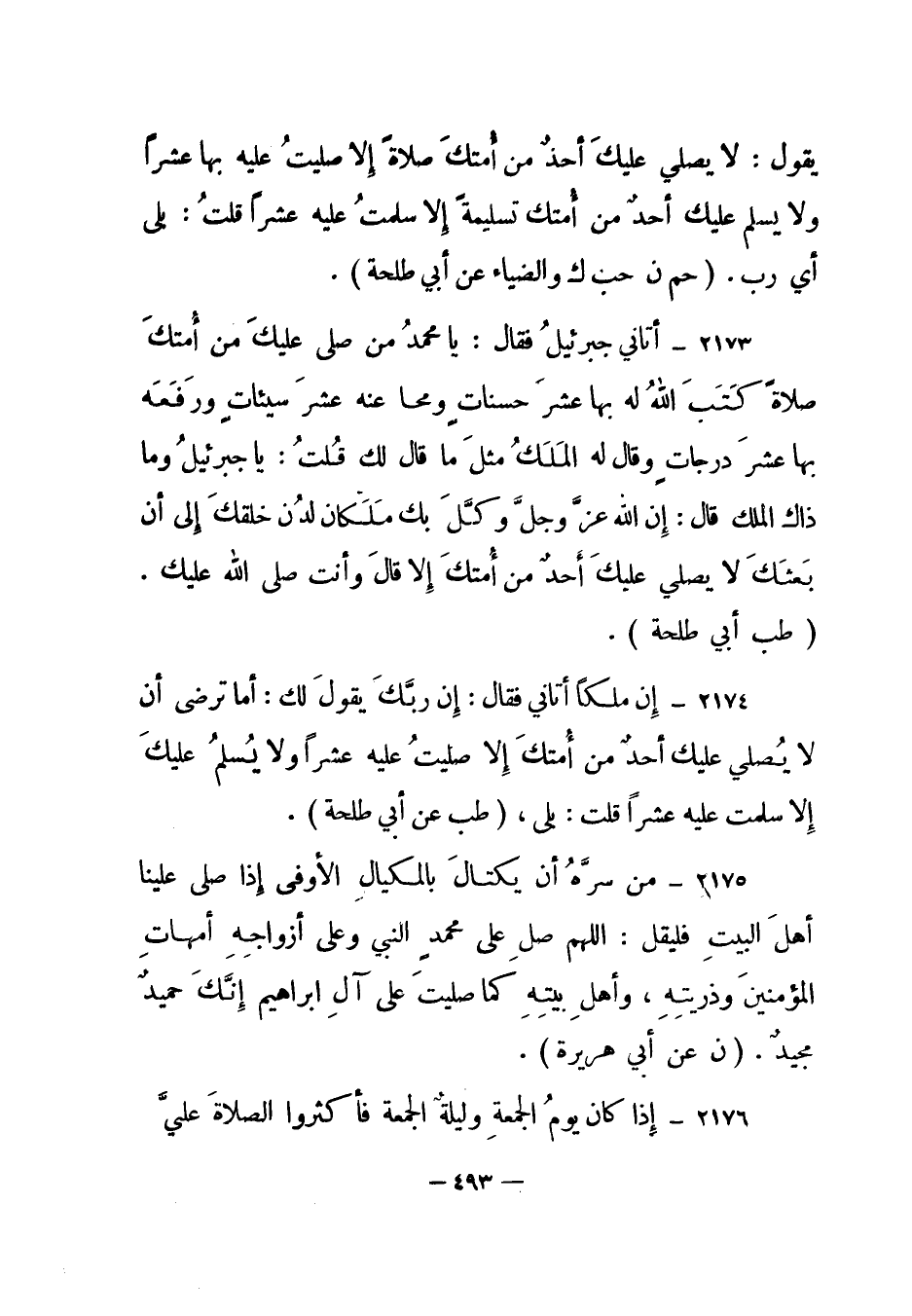 2173 - "أتاني جبرئيل فقال: يا محمد من صلى عليك من أمتك صلاة كتب الله له بها عشر حسنات ومحا عنه عشر سيئات ورفعه بها عشر درجات وقال له الملك مثل ما قال لك قلت: يا جبرئيل وما ذاك الملك قال: إن الله عز وجل وكل بك ملكان لدن خلقك إلى أن بعثك لا يصلي عليك أحد من أمتك إلا قال وأنت صلى الله عليك". (طب أبي طلحة) .