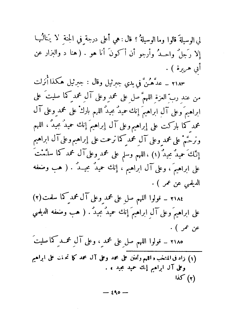 2184 – "قولوا اللهم صل على محمد وعلى آل محمد كما سلمت (2) على إبراهيم وعلى آل إبراهيم إنك حميد مجيد". (هب وضعفه الديلمي عن عمر) .