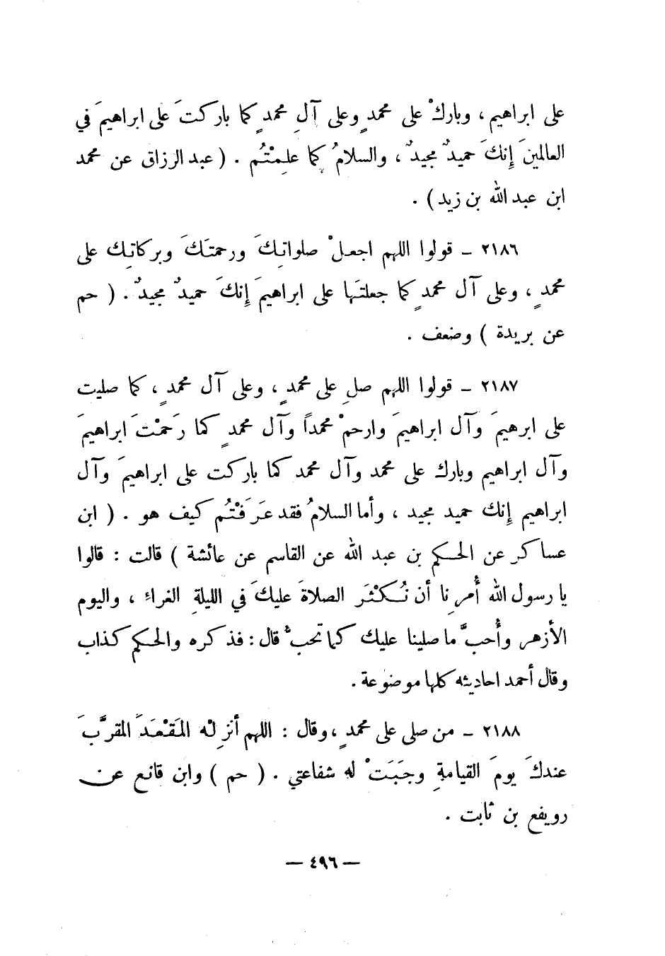 2187 – "قولوا اللهم صل على محمد، وعلى آل محمد، كما صليت على إبراهيم وآل إبراهيم وارحم محمدا وآل محمد كما رحمت إبراهيم وآل إبراهيم وبارك على محمد وآل محمد كما باركت على إبراهيم وآل إبراهيم إنك حميد مجيد، وأما السلام فقد عرفتم كيف هو". (ابن عساكر عن الحكم بن عبد الله عن القاسم عن عائشة) قالت: "قالوا يا رسول الله أمرنا أن نكثر الصلاة عليك في الليلة الغراء، واليوم الأزهر وأحب ما صلينا عليك كما تحب قال: فذكره والحكم كذاب وقال أحمد أحاديثه كلها موضوعة.
