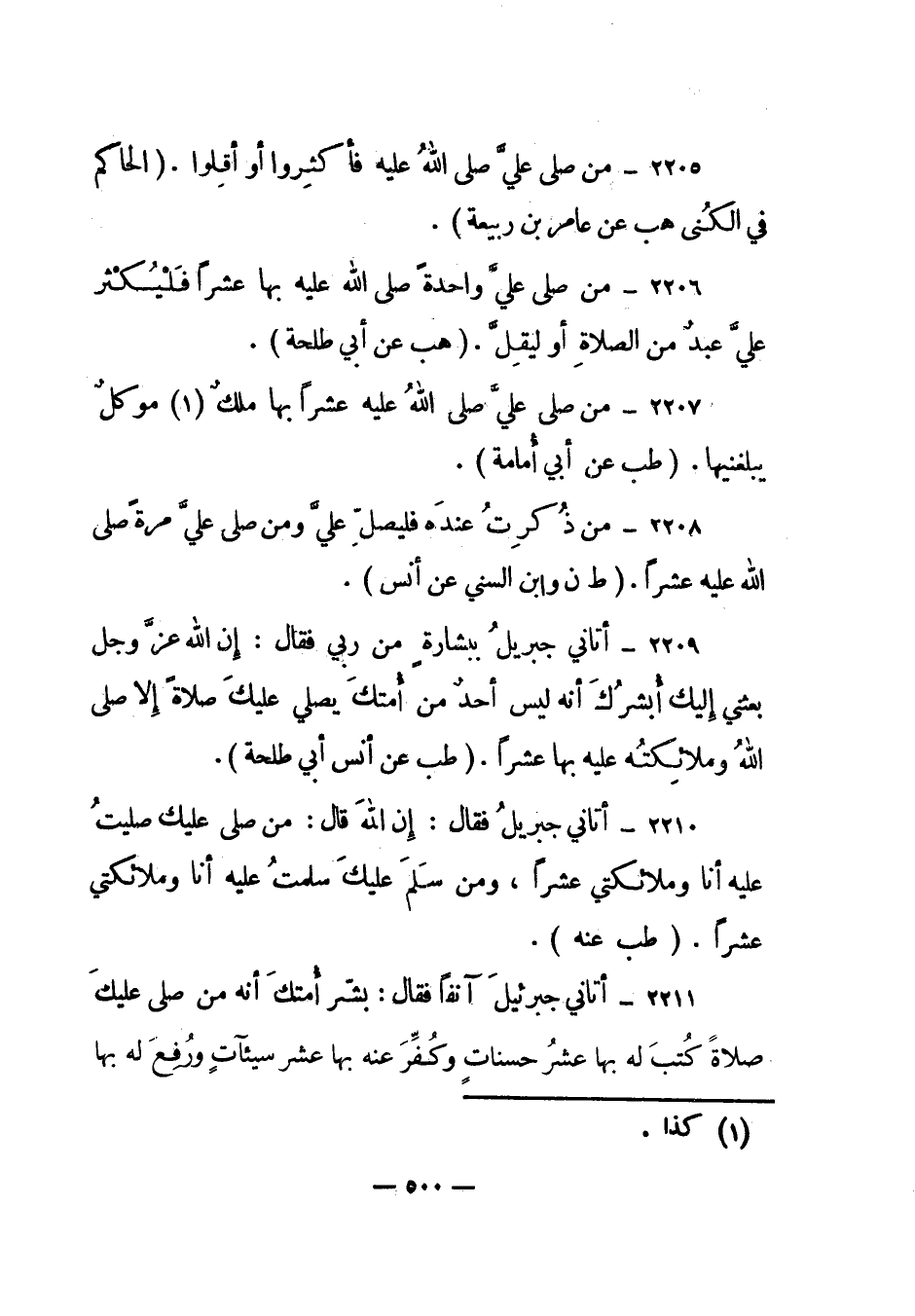 2211 – "أتاني جبرئيل آنفا فقال: بشر أمتك أنه من صلى عليك صلاة كتب له بها عشر حسنات وكفر عنه بها عشر سيئآت ورفع له بها