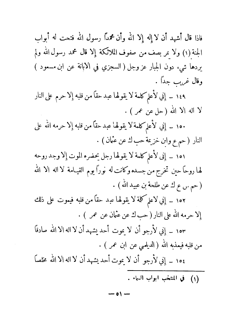 150 – "إني لأعلم كلمة لا يقولها عبد حقا من قلبه إلا حرمه الله على النار" (حم ع وابن خزيمة حب ك عن عثمان) .