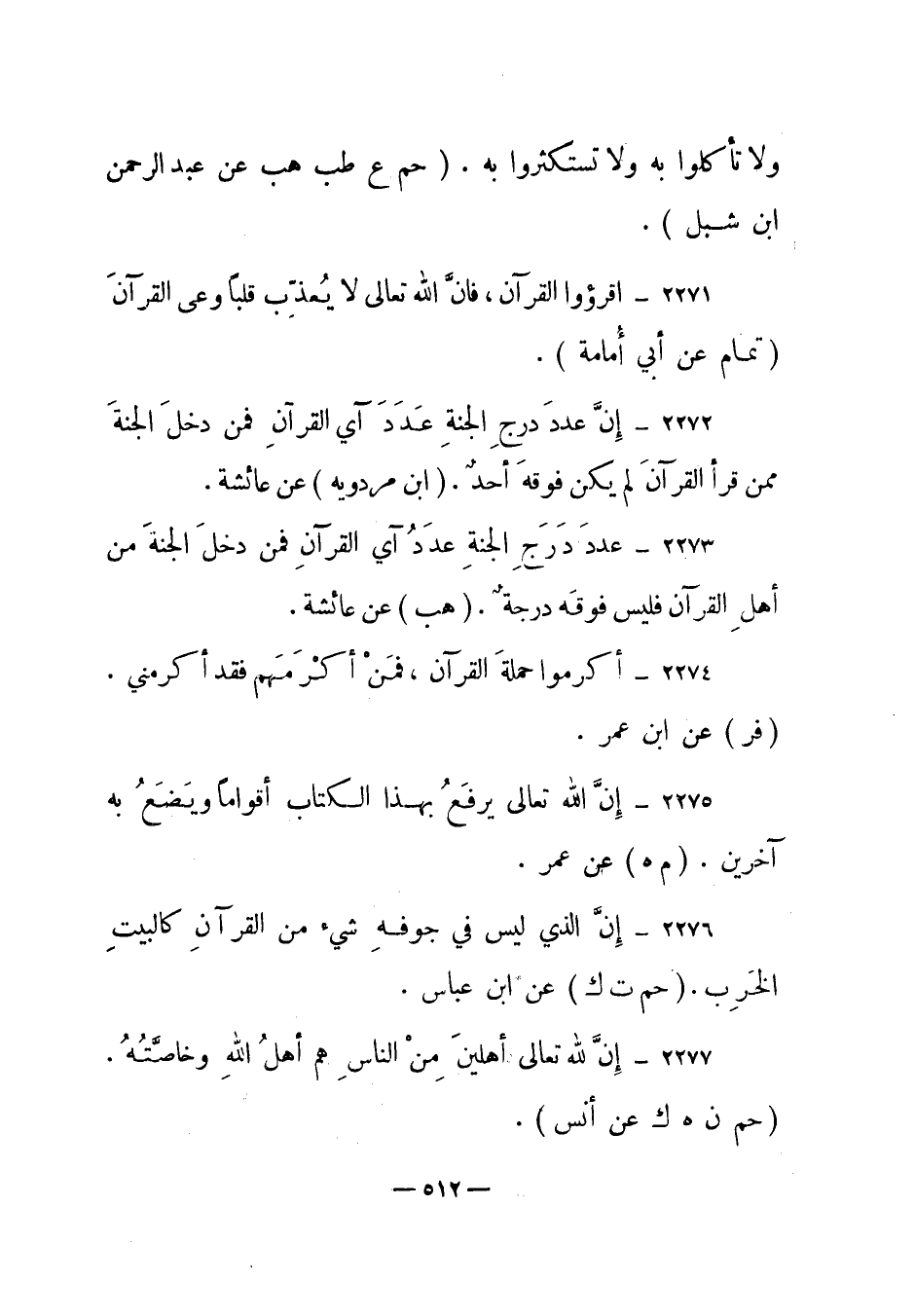 2272 – " إن عدد درج الجنة عدد أي القرآن فمن دخل الجنة ممن قرأ القرآن لم يكن فوقه أحد". (ابن مردويه) عن عائشة.