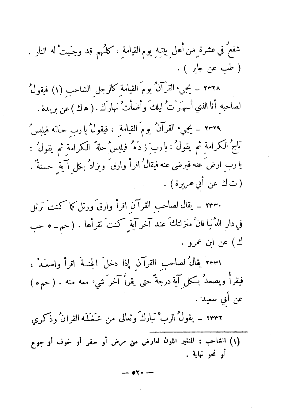 2328 – "يجيء القرآن يوم القيامة كالرجل الشاحب (1) فيقول لصاحبه أنا الذي أسهرت ليلك وأظمأت نهارك". (هـ ك) عن بريدة.