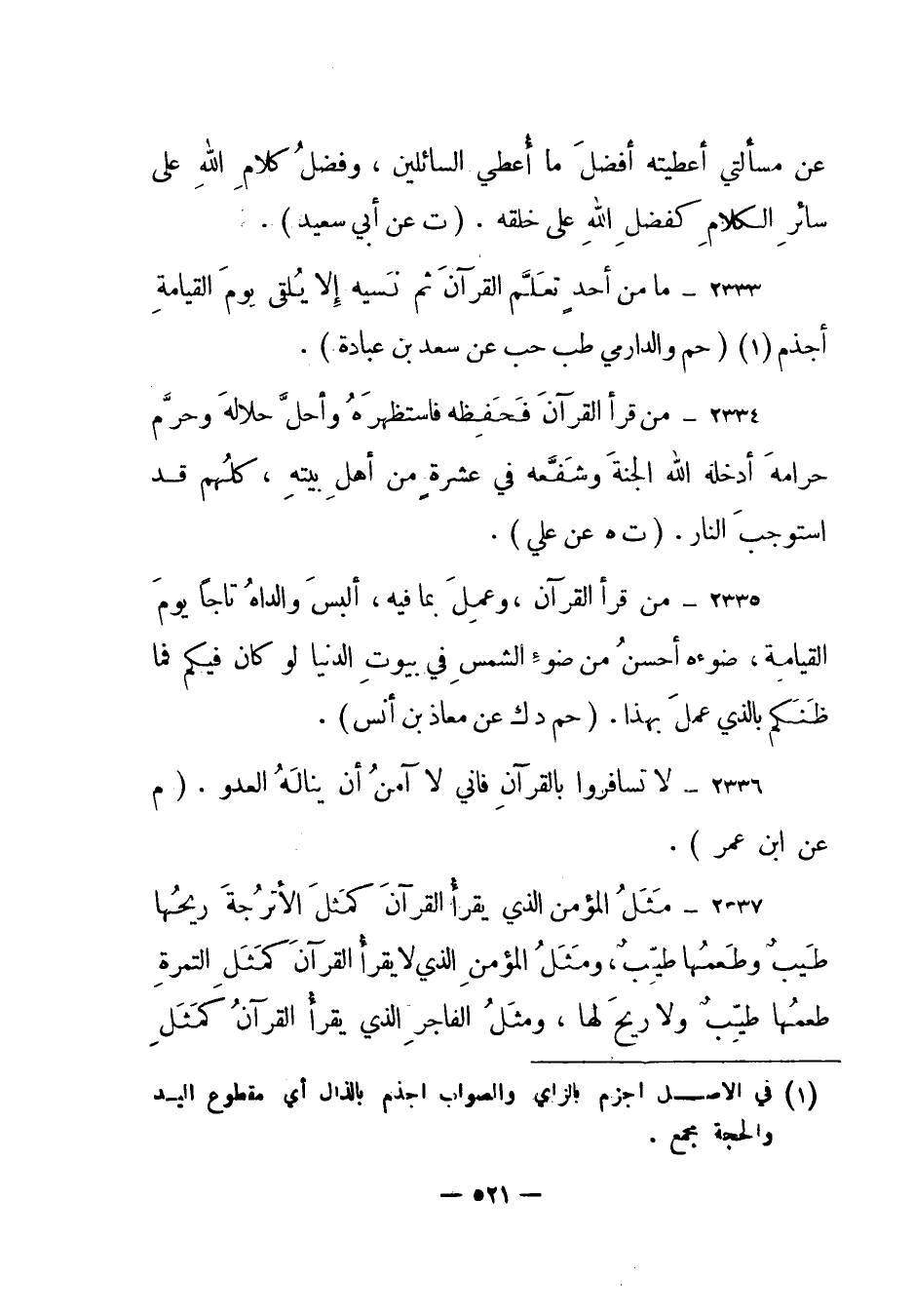 2333 – " ما من أحد تعلم القرآن ثم نسيه إلا يلقى يوم القيامة أجذم" (1) . (حم والدارمي طب حب عن سعد بن عبادة) .