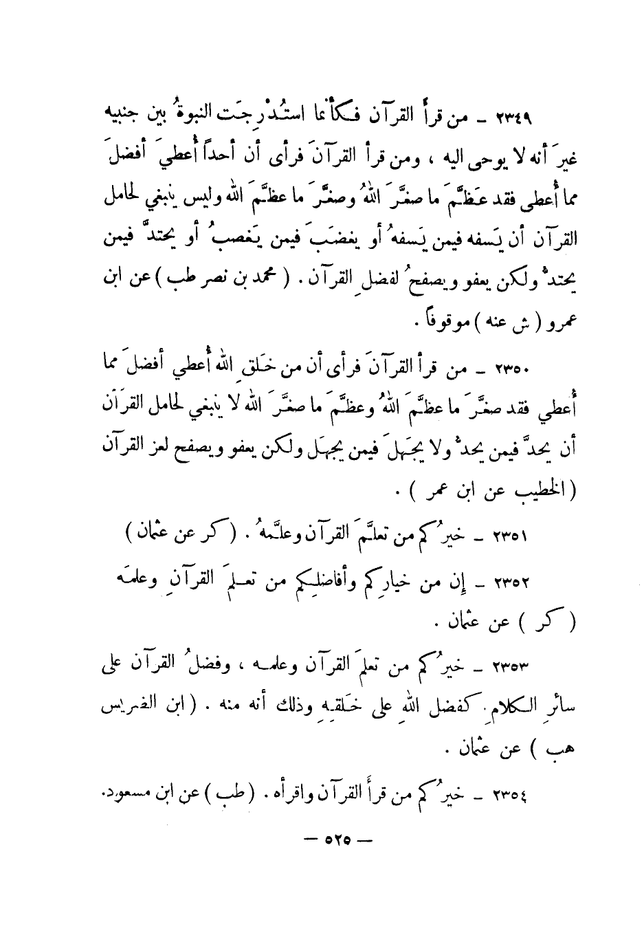 2353 – "خيركم من تعلم القرآن وعلمه، وفضل القرآن على سائر الكلام كفضل الله على خلقه وذلك أنه منه". (ابن الضريس هب) عن عثمان.