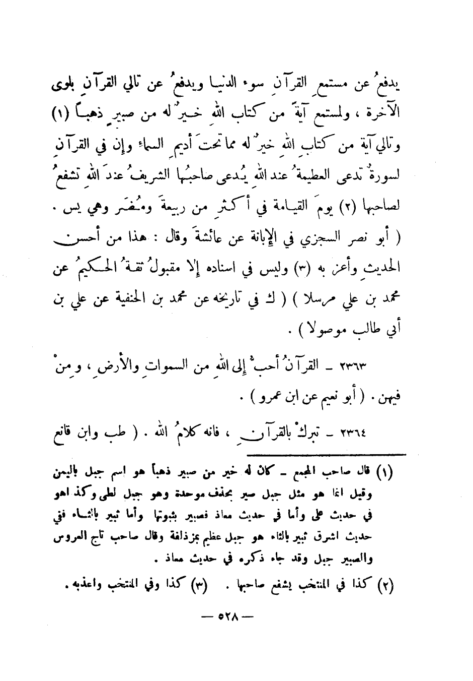 2363 – "القرآن أحب إلى الله من السموات والأرض، ومن فيهن". (أبو نعيم عن ابن عمرو) .