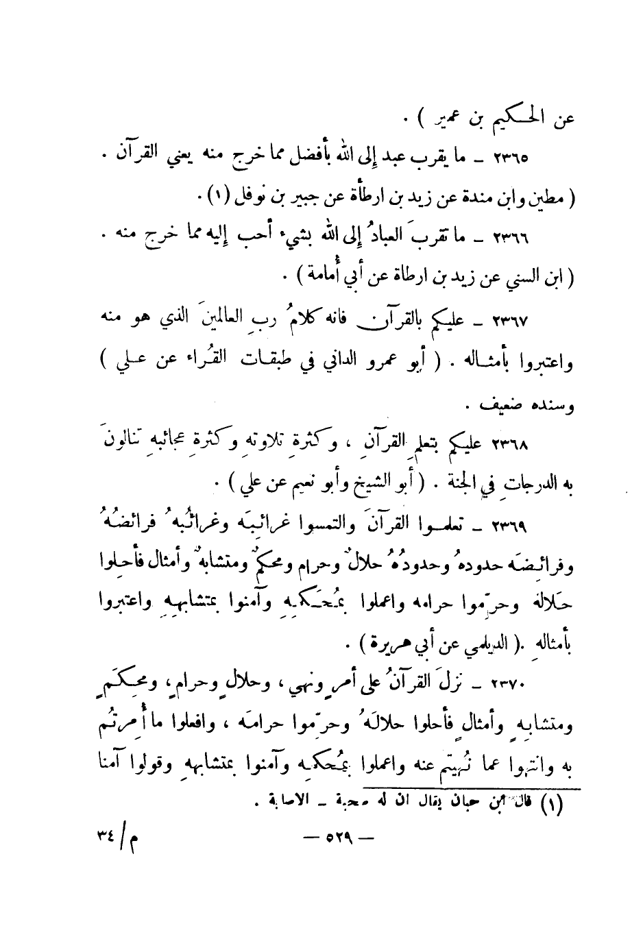 2365 – "ما يقرب عبد إلى الله بأفضل مما خرج منه يعني القرآن". (مطين وابن مندة عن زيد بن ارطأة عن جبير بن نوفل (1)