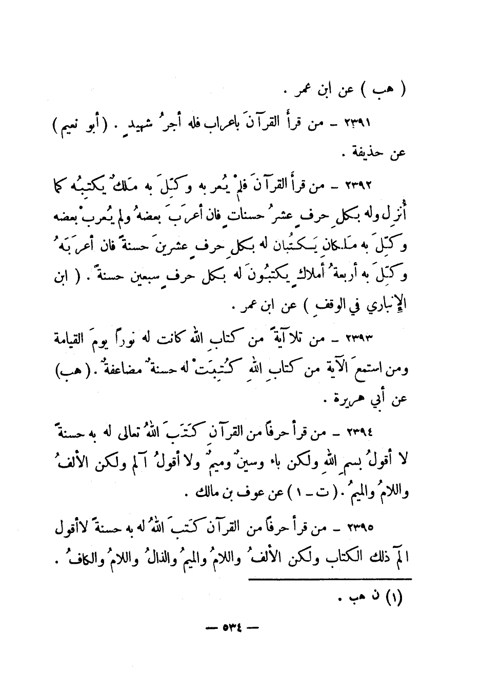 2392 – " من قرأ القرآن فلم يعربه وكل به ملك يكتبه كما أنزل وله بكل حرف عشر حسنات فإن أعرب بعضه ولم يعرب بعضه وكل به ملكان يكتبان له بكل حرف عشرين حسنة فإن أعربه وكل به أربعة أملاك يكتبون له بكل حرف سبعين حسنة". (ابن الإنباري في الوقف) عن ابن عمر.