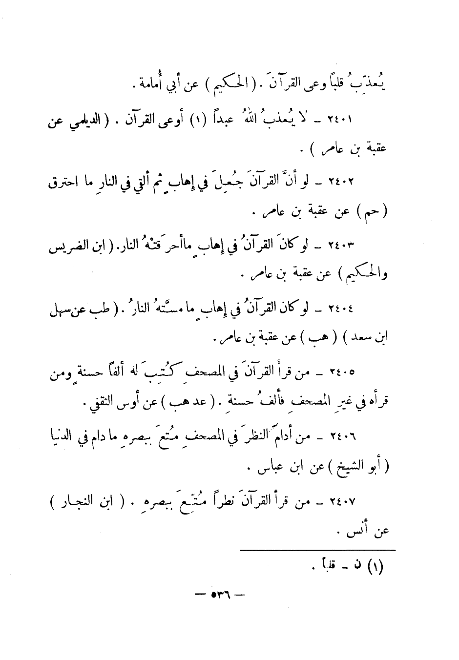 2405 – "من قرأ القرآن في المصحف كتب له ألفا حسنة ومن قرأه في غير المصحف فألف حسنة". (عد هب) عن أوس الثقفي.