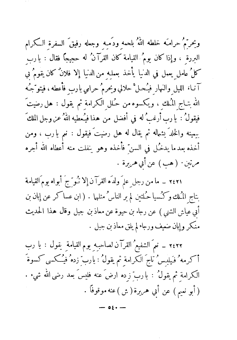 2421 – "ما من رجل علم ولده القرآن إلا توج أبواه يوم القيامة بتاج الملك وكسيا حلتين لم ير الناس مثلهما". (ابن عساكر عن إبان بن أبي عياش الشني) عن رجاء بن حيوة عن معاذ بن جبل وقال هذا الحديث منكر وإبان ضعيف ورجاء لم يلق معاذ بن جبل.