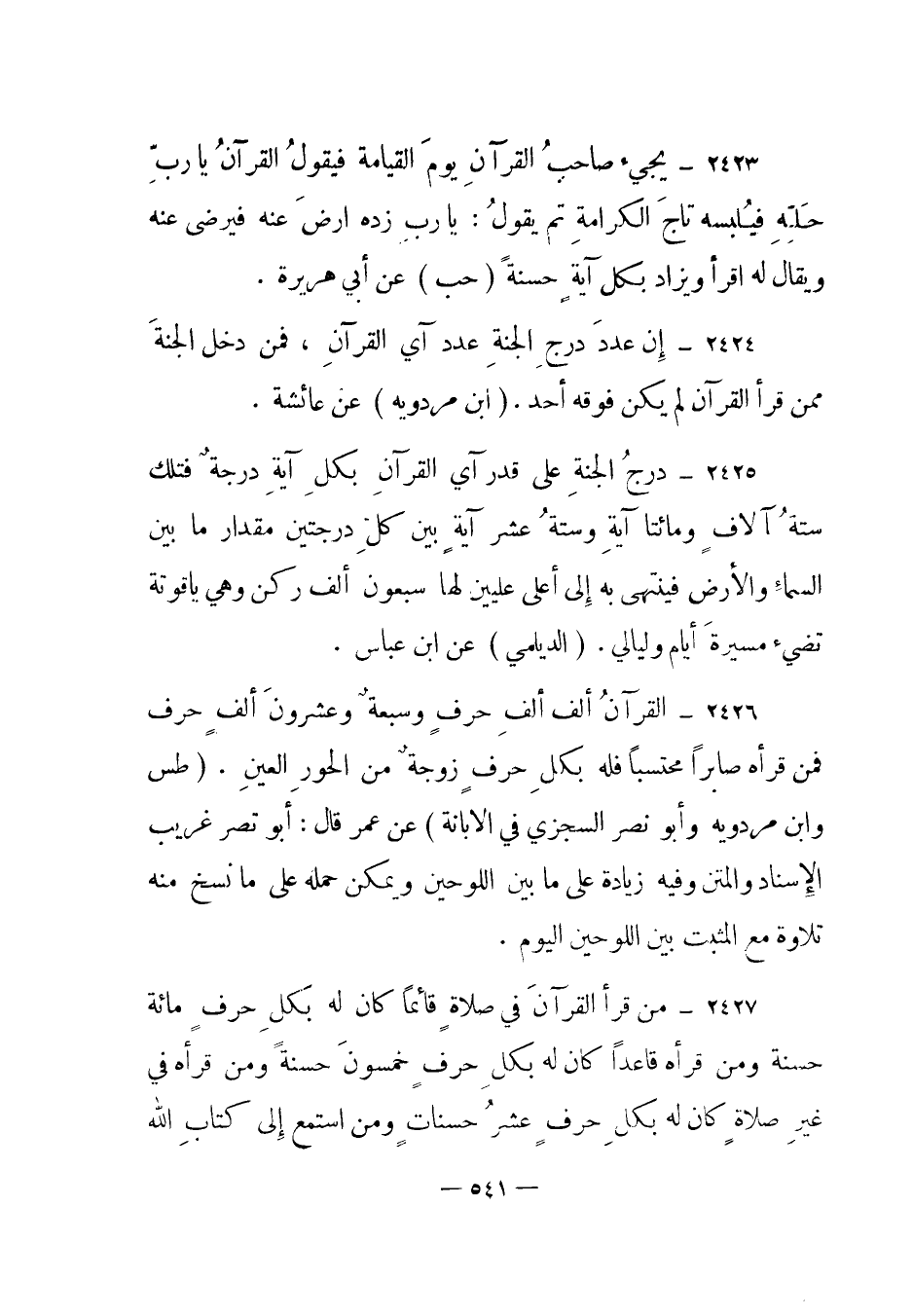 2425 – "درج الجنة على قدر آي القرآن بكل آية درجة فتلك ستة آلاف ومائتا آية وستة عشر آية بين كل درجتين مقدار ما بين السماء والأرض فينتهى به إلى أعلى عليين لها سبعون ألف ركن وهي ياقوتة تضيء مسيرة أيام وليالي". (الديلمي) عن ابن عباس.