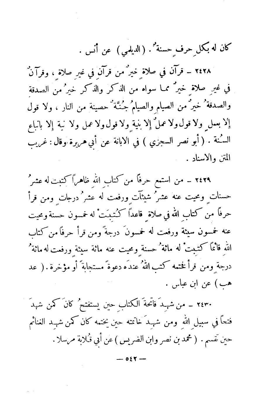 2429 – "من استمع حرفا من كتاب الله ظاهرا كتبت له عشر حسنات ومحيت عنه عشر سيئات ورفعت له عشر درجات ومن قرأ حرفا من كتاب الله في صلاة قاعدا كتبت له خمسون حسنة ومحيت عنه خمسون سيئة ورفعت له خمسون درجة ومن قرأ حرفا من كتاب الله قائما كتبت له مائة حسنة ومحيت عنه مائة سيئة ورفعت له مائة درجة ومن قرأ فختمه كتب الله عنده دعوة مستجابة أو مؤخرة". (عد هب) عن ابن عباس.
