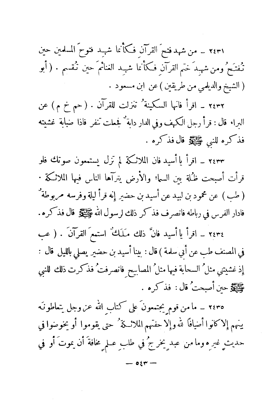 2431- "من شهد فتح القرآن فكأنما شهد فتوح المسلمين حين تفتح ومن شهد ختم القرآن فكأنما شهد الغنائم حين تقسم". (الشيخ والديلمي من طريقين) عن ابن مسعود.