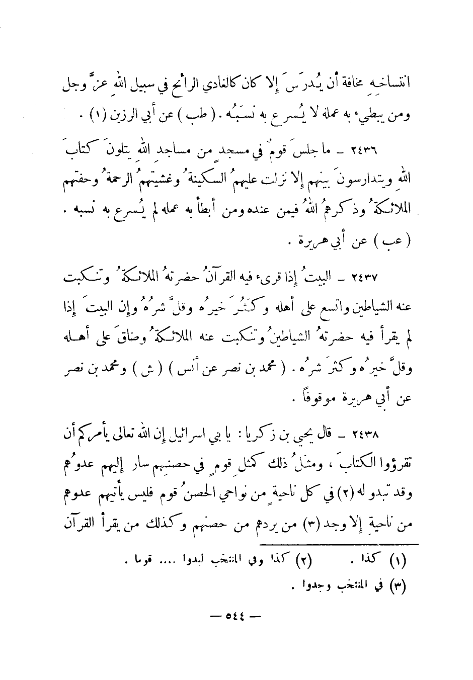 2436 – "ما جلس قوم في مسجد من مساجد الله يتلون كتاب الله ويتدارسون بينهم إلا نزلت عليهم السكينة وغشيتهم الرحمة وحفتهم الملائكة وذكرهم الله فيمن عنده ومن أبطأ به عمله لم يسرع به نسبه". (عب) عن أبي هريرة.