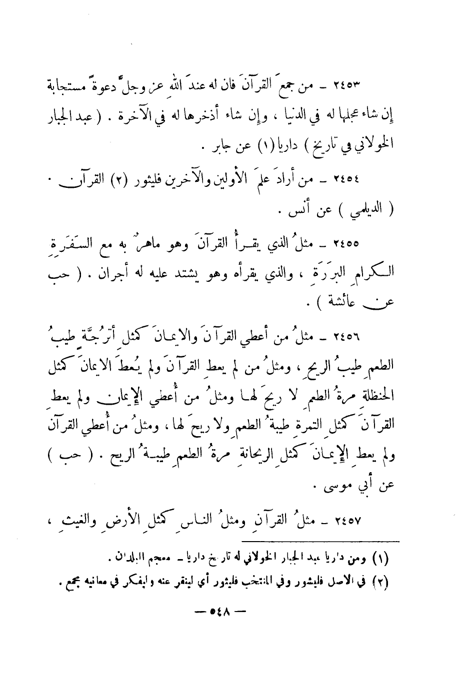 2453 – "من جمع القرآن فإن له عند الله عز وجل دعوة مستجابة إن شاء عجلها له في الدنيا، وإن شاء أذخرها له في الآخرة". (عبد الجبار الخولاني في تاريخ) داريا (1) عن جابر.