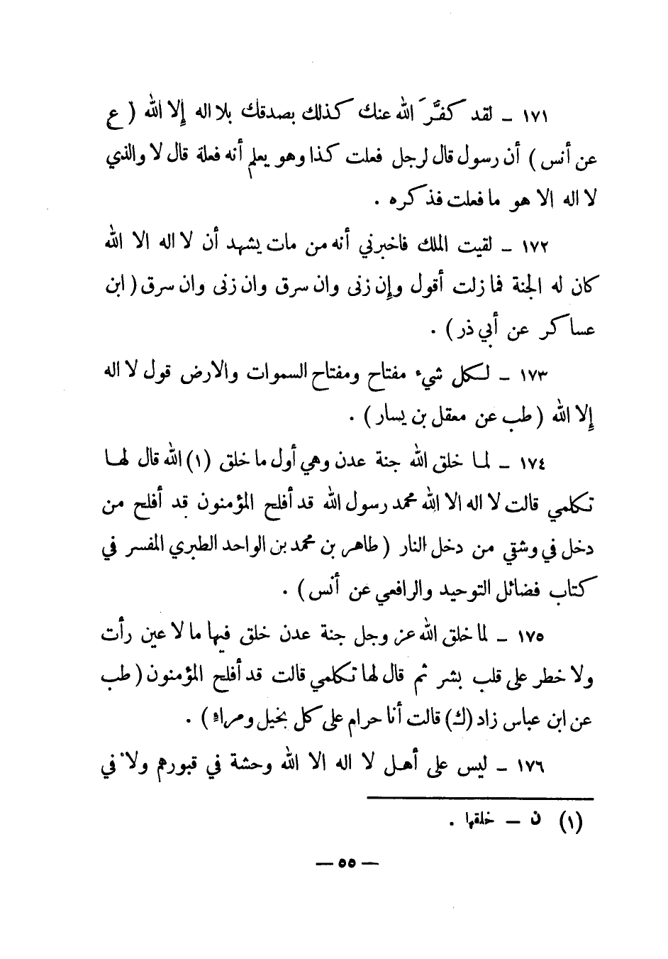 171 – "لقد كفر الله عنك كذلك بصدقك بلا إله إلا الله" (ع عن أنس) "أن رسول الله قال لرجل فعلت كذا وهو يعلم أنه فعلة قال لا والذي لا إله إلا هو مافعلت" فذكره.
