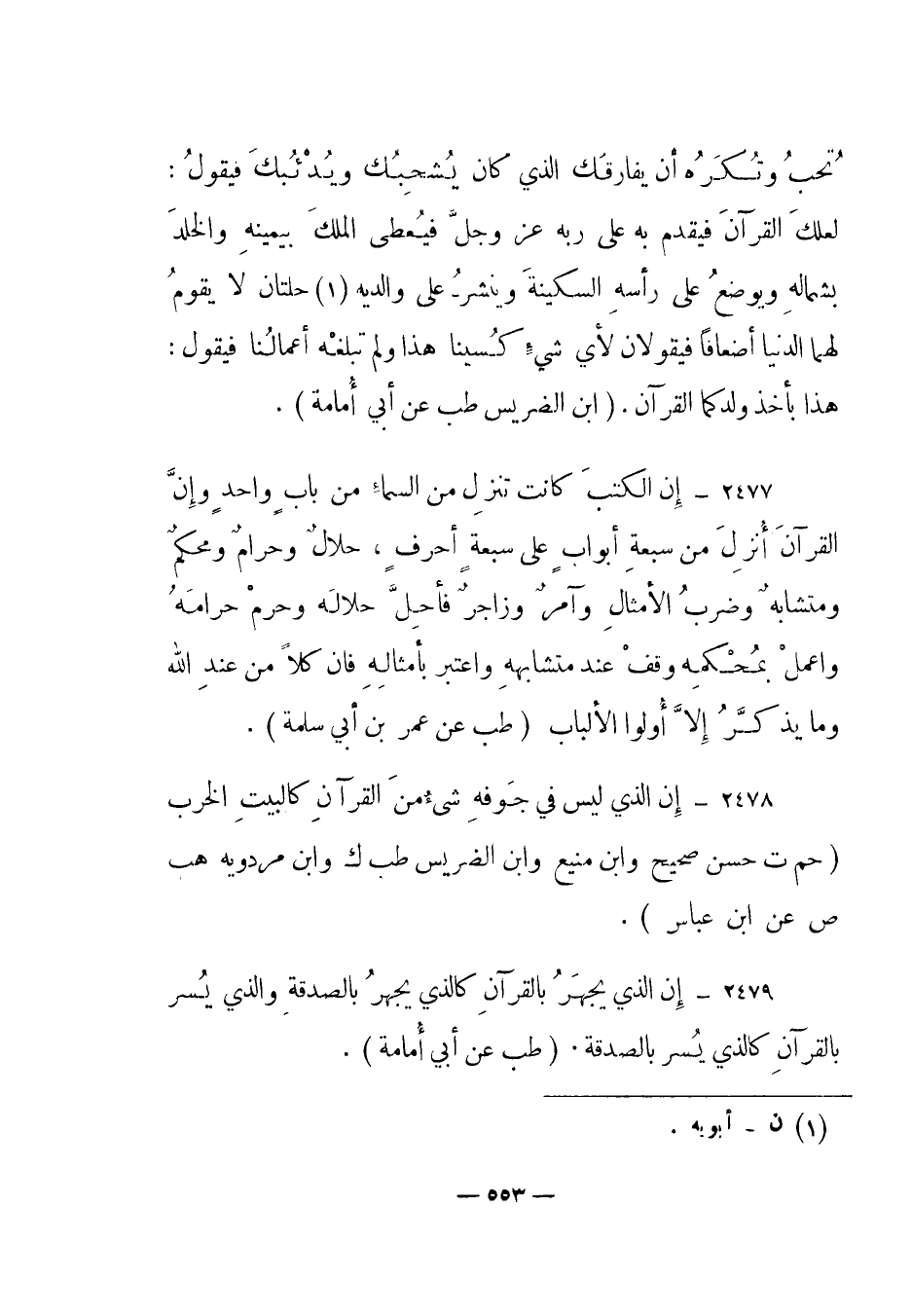 2477 – "إن الكتب كانت تنزل من السماء من باب واحد وإن القرآن أنزل من سبعة أبواب على سبعة أحرف، حلال وحرام ومحكم ومتشابه وضرب الأمثال وآمر وزاجر فأحل حلاله وحرم حرامه واعمل بمحكمه وقف عند متشابهه واعتبر بأمثاله فإن كلا من عند الله وما يذكر إلا أولوا الألباب". (طب عن عمر بن أبي سلمة) .