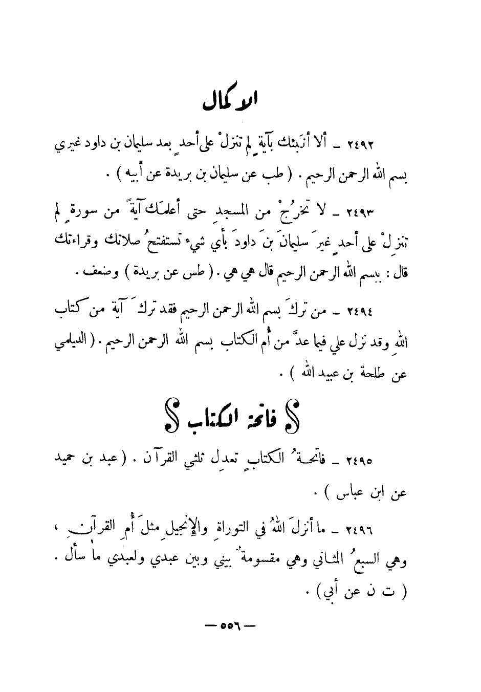 2496 – "ما أنزل الله في التوراة والإنجيل مثل أم القرآن، وهي السبع المثاني وهي مقسومة بيني وبين عبدي ولعبدي ما سأل". (ت ن عن أبي) .