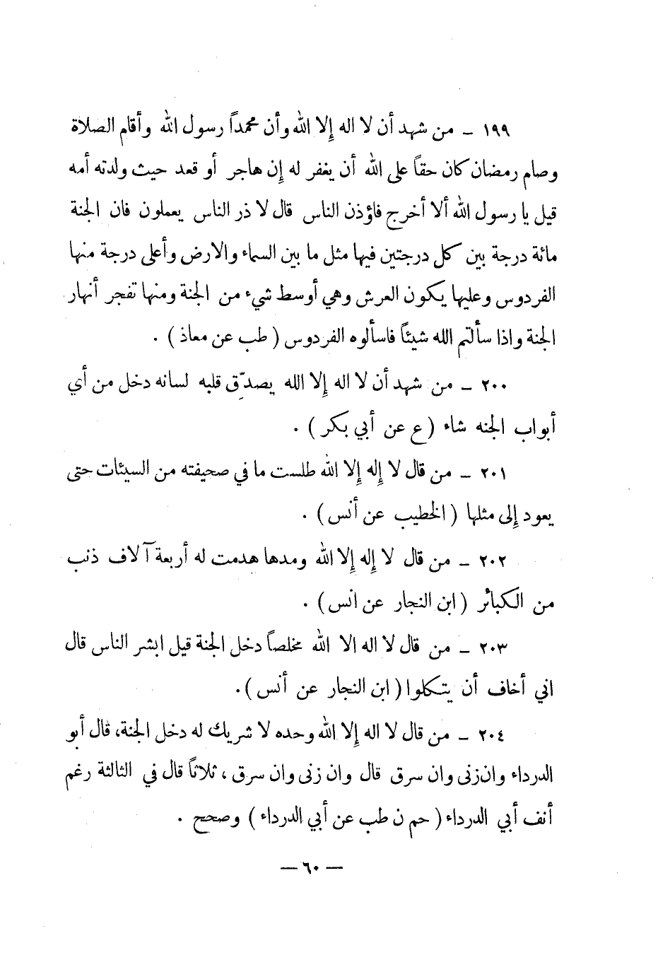 204 – "من قال لا إله إلا الله وحده لا شريك له دخل الجنة، قال أبو الدرداء وإن زنى وإن سرق قال وإن زنى وإن سرق، ثلاثا قال في الثالثة رغم أنف أبي الدرداء" (حم ن طب عن أبي الدرداء) وصحح.
