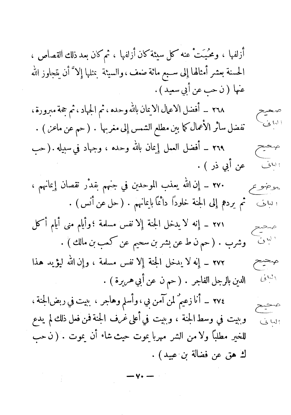 273 – "أنا زعيم لمن آمن بي، وأسلم وهاجر، ببيت في ربض الجنة، وببيت في وسط الجنة، وببيت في أعلى غرف الجنة فمن فعل ذلك لم يدع للخير مطلبا ولا من الشر مهربا يموت حيث شاء أن يموت". (ن حب ك هق عن فضالة بن عبيد) .