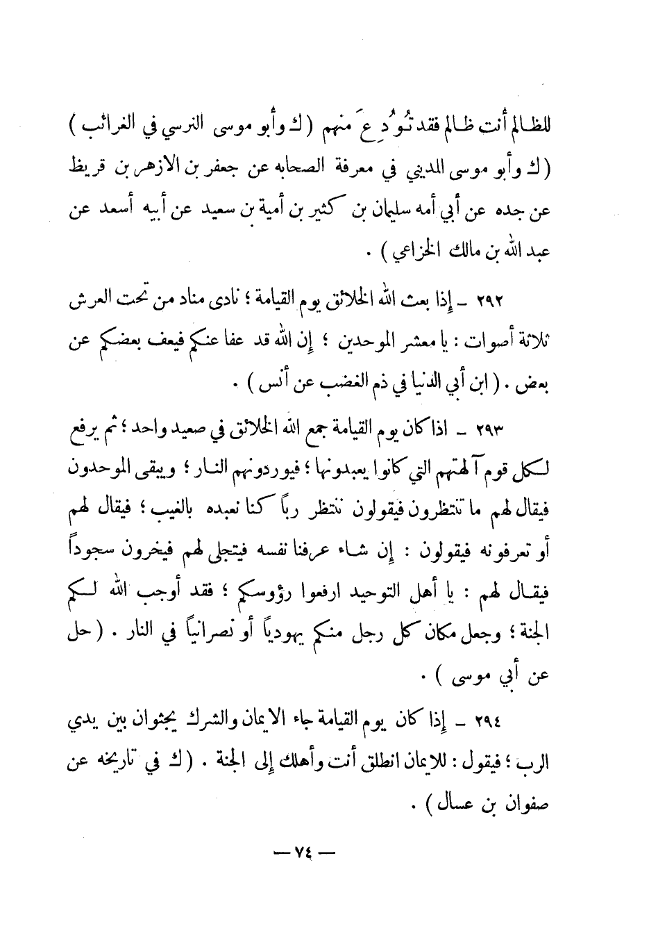 293 – "إذا كان يوم القيامة جمع الله الخلائق في صعيد واحد؛ ثم يرفع لكل قوم آلهتهم التي كانوا يعبدونها؛ فيوردونهم النار؛ ويبقى الموحدون فيقال لهم ماتنتظرون فيقولون ننتظر ربا كنا نعبده بالغيب؛ فيقال لهم أو تعرفونه فيقولون: إن شاء عرفنا نفسه فيتجلى لهم فيخرون سجودا فيقال لهم: يا أهل التوحيد ارفعوا رؤوسكم؛ فقد أوجب الله لكم الجنة؛ وجعل مكان كل رجل منكم يهوديا أو نصرانيا في النار". (حل عن أبي موسى) .