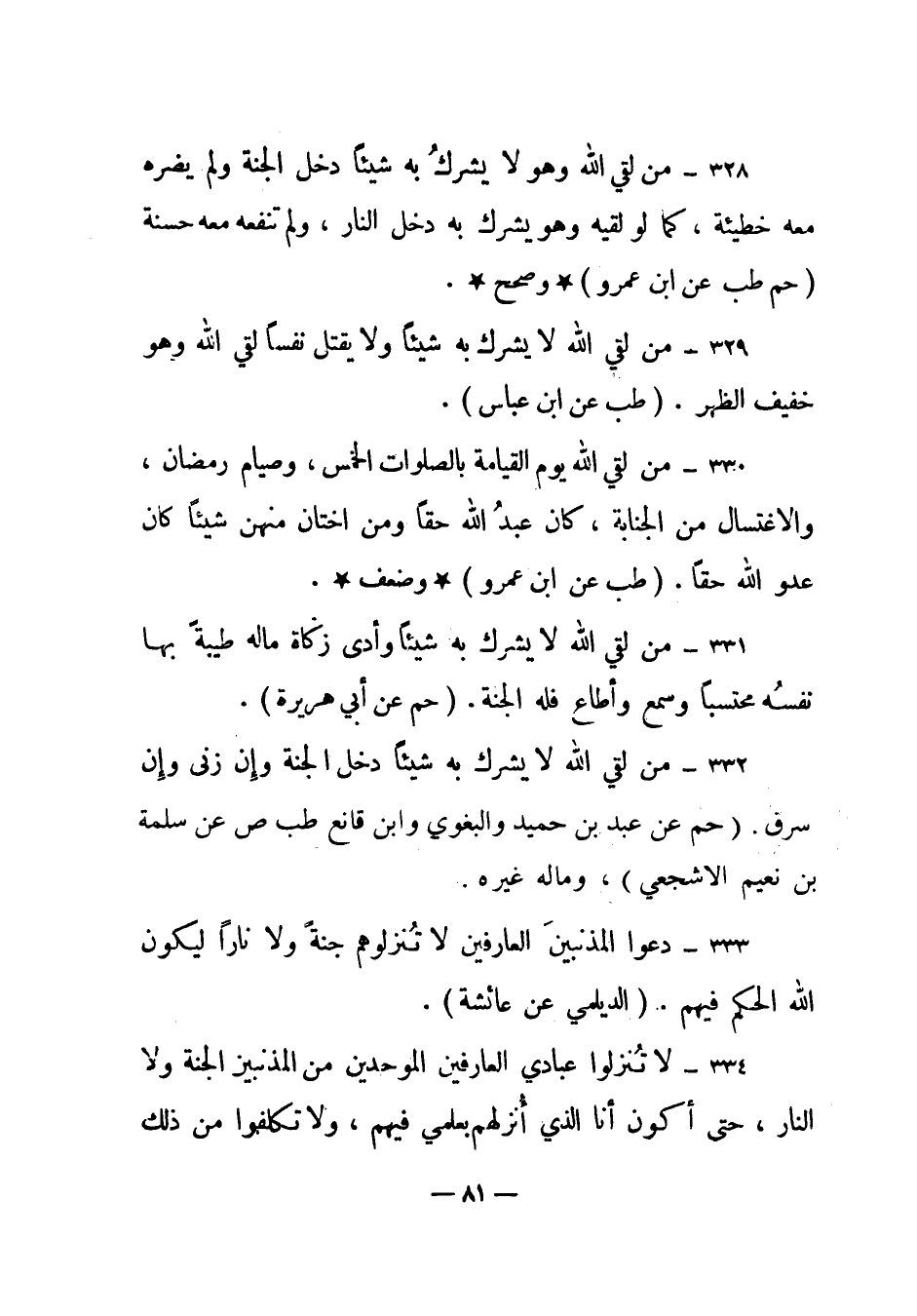 328 – "من لقي الله وهولا يشرك به شيئا دخل الجنة ولم يضره معه خطيئة، كما لو لقيه وهويشرك به دخل النار، ولم تنفعه معه حسنة". (حم طب عن ابن عمرو) * وصحح *.