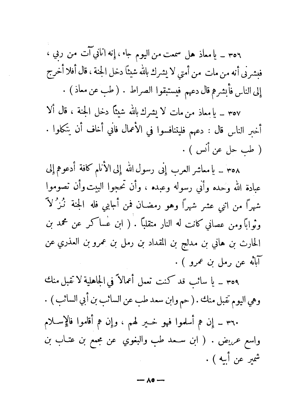 357 – "يا معاذ من مات لا يشرك بالله شيئا دخل الجنة، قال ألا أخبر الناس قال: دعهم فليتنافسوا في الأعمال فإني أخاف أن يتكلوا". (طب حل عن أنس) .