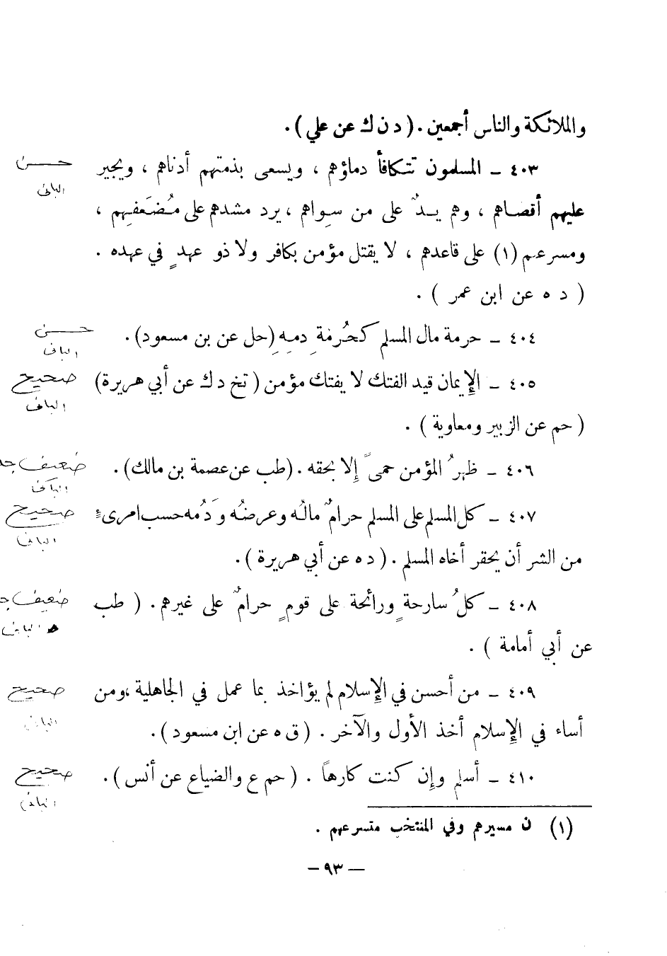 403 – "المسلمون تتكافأ دماؤهم، ويسعى بذمتهم أدناهم، ويجير عليهم أقصاهم، وهم يد على من سواهم، يرد مشدهم على مضعفهم، ومسرعهم (1) على قاعدهم، لا يقتل مؤمن بكافر ولا ذوعهد في عهده". (د هـ عن ابن عمر) .