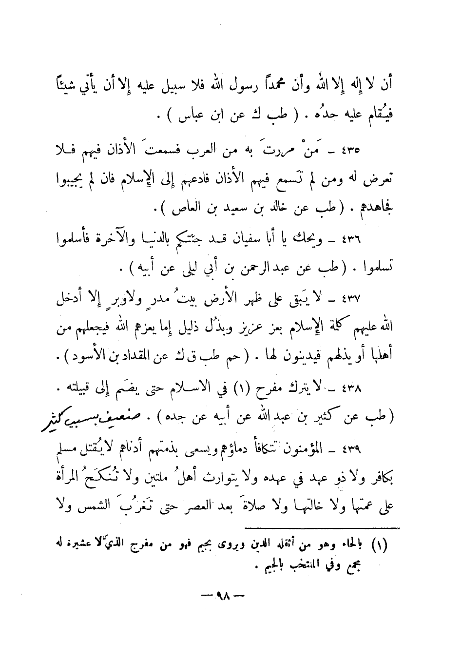 435 – "من مررت به من العرب فسمعت الأذان فيهم فلا تعرض له ومن لم تسمع فيهم الأذان فادعهم إلى الإسلام فإن لم يجيبوا فجاهدهم". (طب عن خالد بن سعيد بن العاص) .