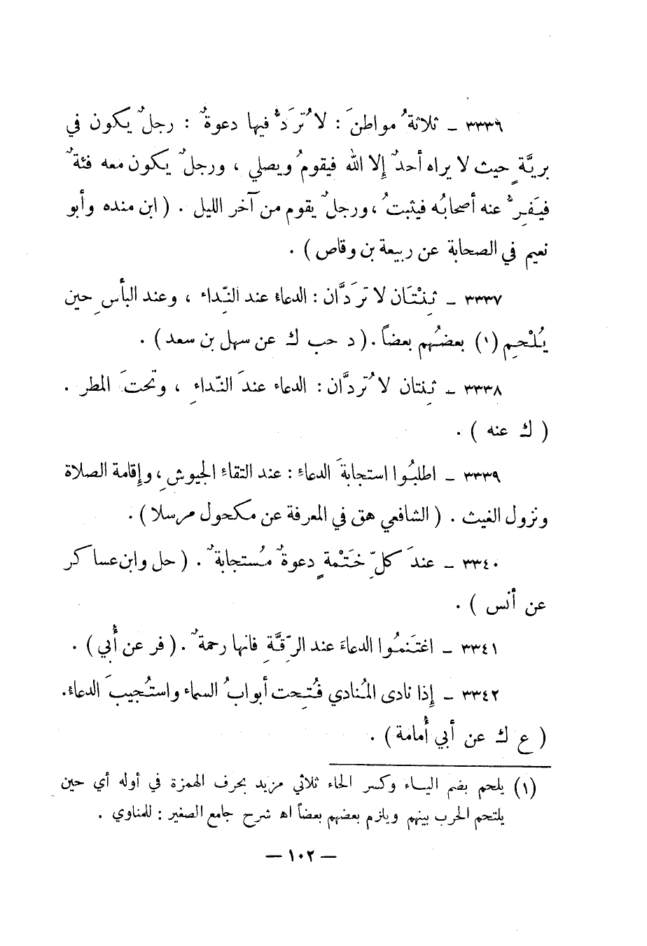 3336- "ثلاثة مواطن: لا ترد فيهن دعوة: رجل يكون في برية حيث لا يراه أحد إلا الله فيقوم ويصلي، ورجل يكون معه فئة فيفر عنه أصحابه فيثبت، ورجل يقوم من آخر الليل". "ابن منده وأبو نعيم في الصحابة عن ربيعة بن وقاص".