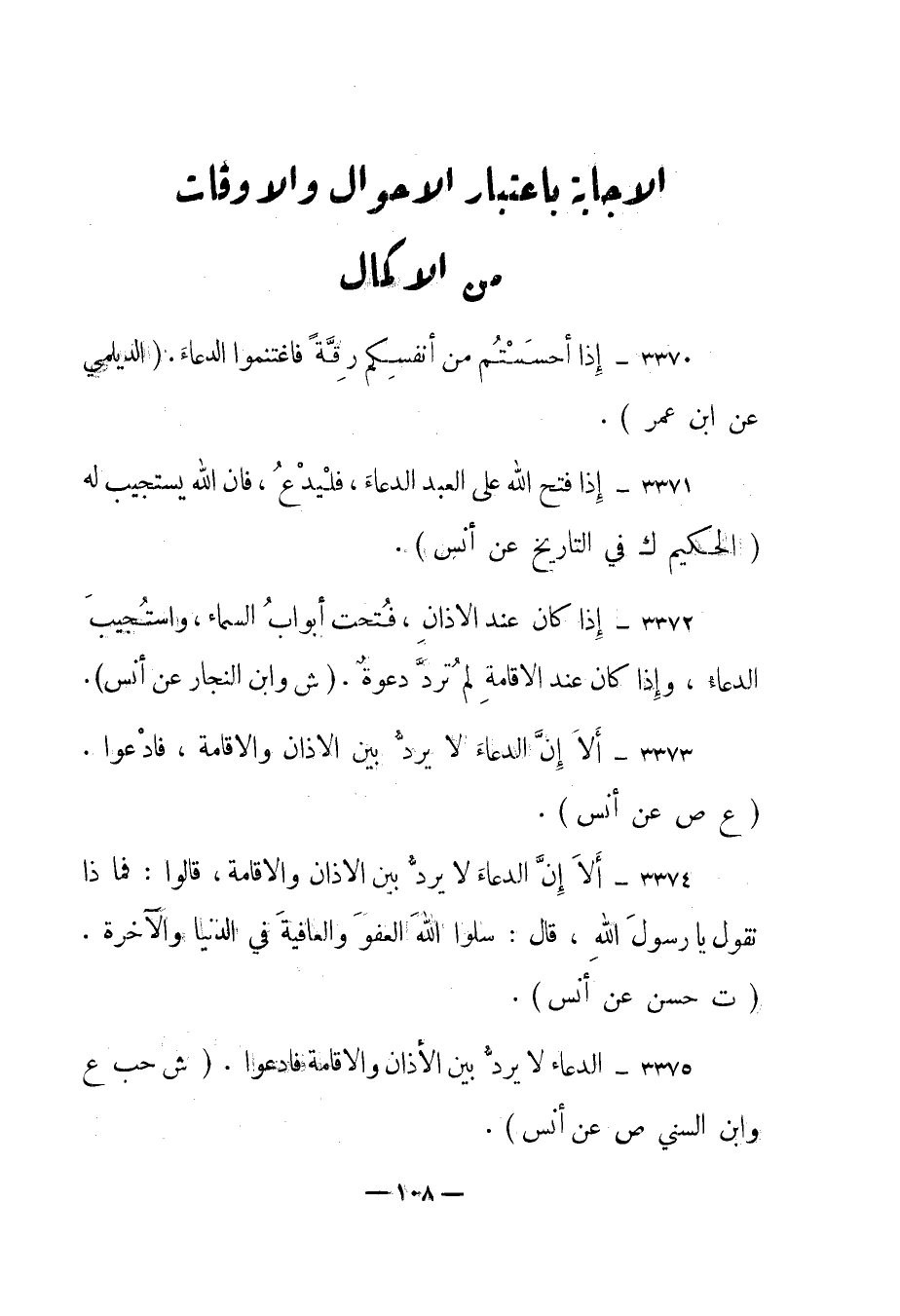 3375- "الدعاء لا يرد بين الأذان والإقامة فادعوا". "ش حب ع وابن السني ص عن أنس".