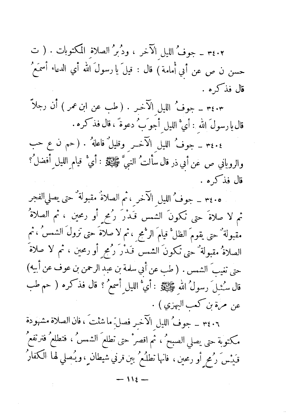 3406- "جوف الليل الآخر فصل ما شئت، فإن الصلاة مشهودة مكتوبة حتى يصلي الصبح، ثم اقصر حتى تطلع الشمس، فتطلع فترتفع قيس رمح أو رمحين، فإنها تطلع بين قرني شيطان، ويصلي لها الكفار