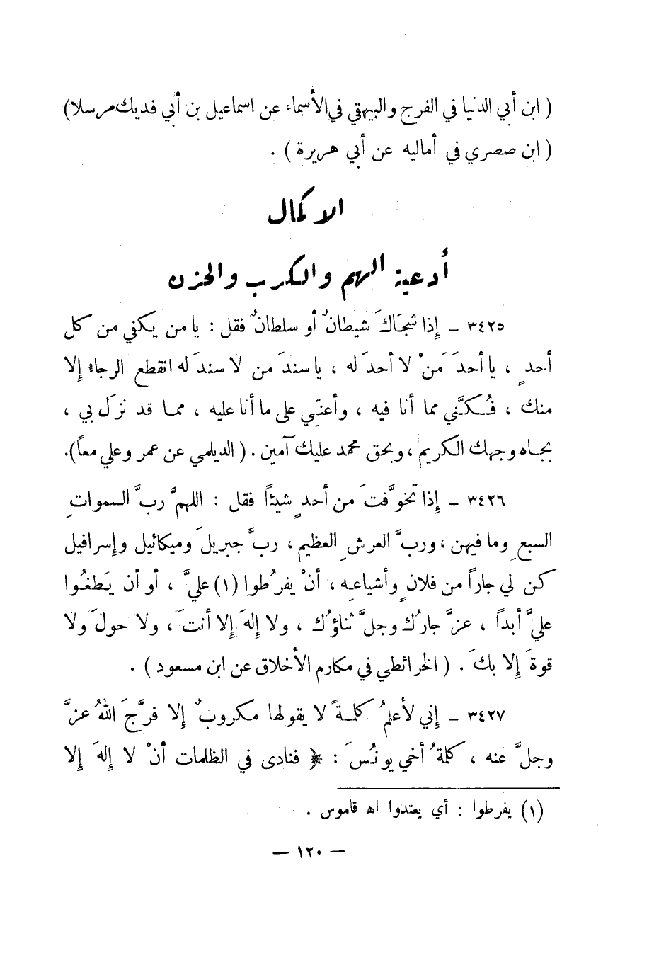 3425- "إذا شجاك شيطان أو سلطان فقل: يا من يكفي من كل أحد، يا أحد من لا أحد له، يا سند من لا سند له انقطع الرجاء إلا منك، فكني مما أنا فيه، وأعني على ما أنا عليه، مما قد نزل بي، بجاه وجهك الكريم، وبحق محمد عليك آمين". "الديلمي عن عمر وعلي معا".