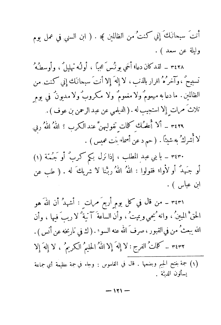 3428- "لقد كان دعاء أخي يونس عجبا، أوله تهليل، وأوسطه تسبيح، وآخره إقرار بالذنب، لا إله إلا أنت سبحانك إني كنت من الظالمين. ما دعا مهموم ولا مغموم ولا مكروب ولا مديون في يوم ثلاث مرات إلا أستجيب له". "الديلمي عن عبد الرحمن بن عوف".