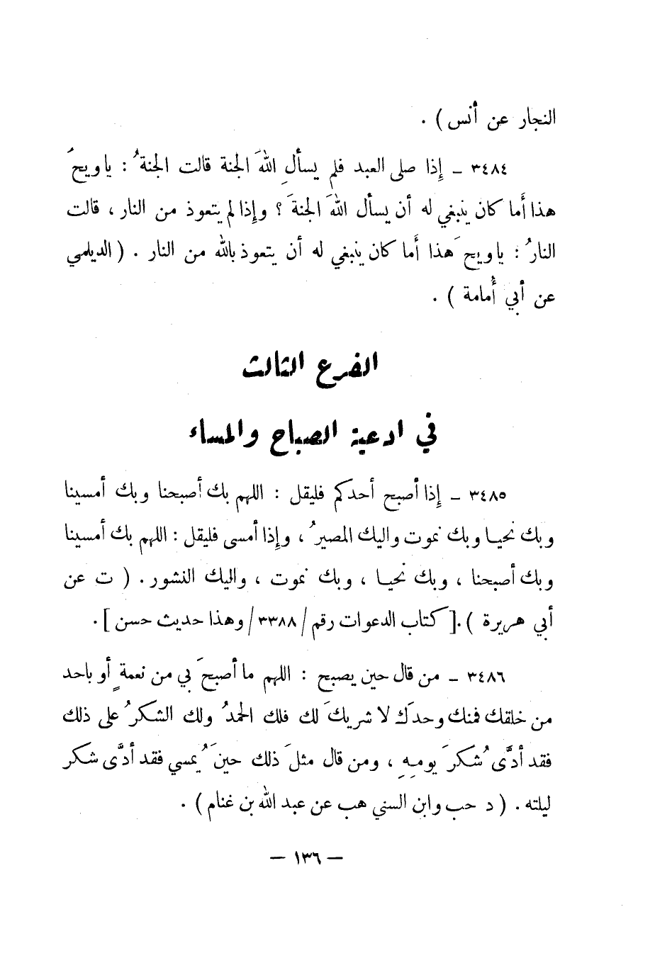 3486- "من قال حين يصبح: اللهم ما أصبح بي من نعمة أو بأحد من خلقك فمنك وحدك لا شريك لك فلك الحمد ولك الشكر على ذلك فقد أدى شكر يومه، ومن قال مثل ذلك حين يمسي فقد أدى شكر ليلته". "د حب وابن السني هب عن عبد الله بن غنام".