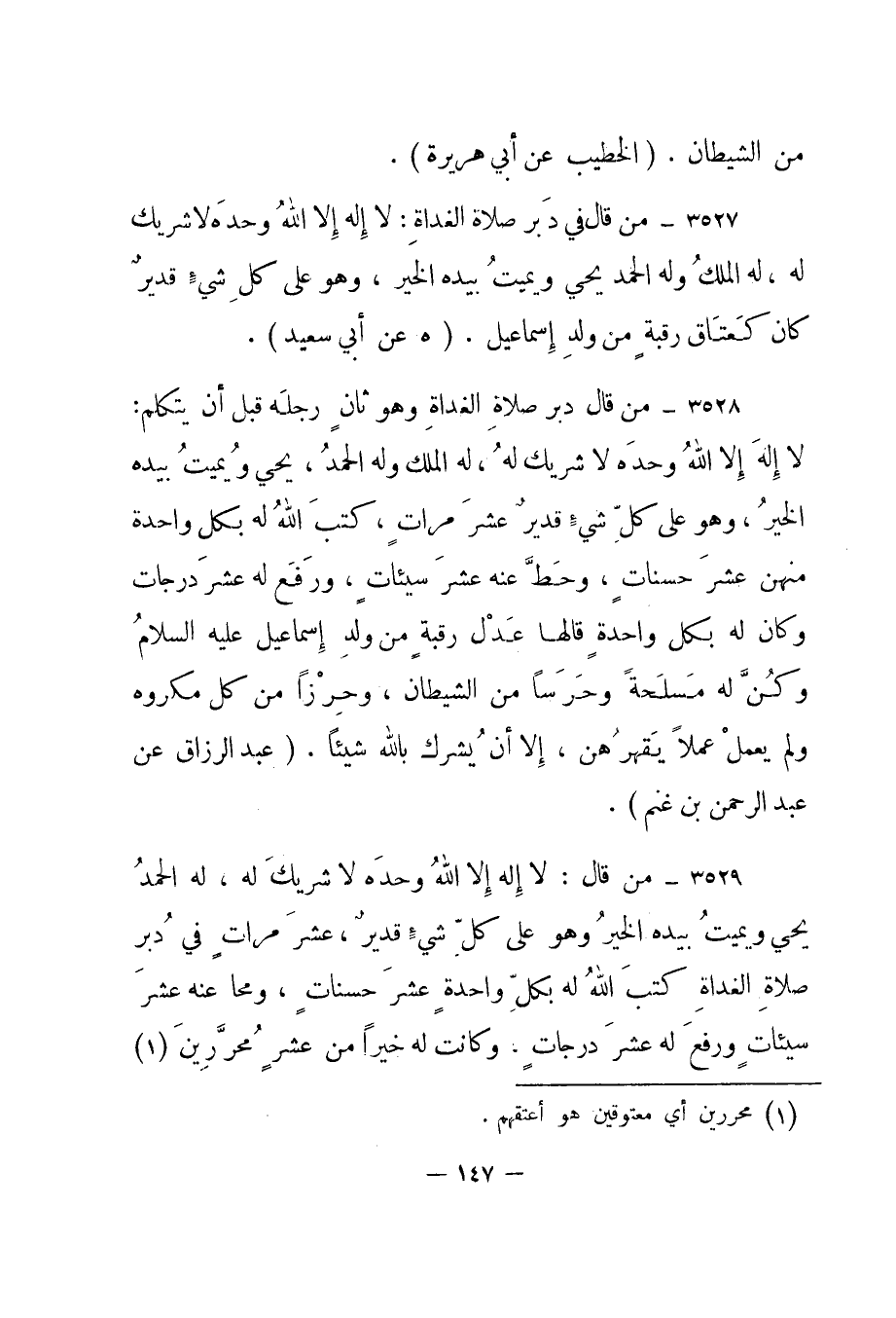 3529- "من قال: لا إله إلا الله وحده لا شريك له، له الحمد يحي ويميت بيده الخير وهو على كل شيء قدير، عشر مرات في دبر صلاة الغداة كتب الله له بكل واحدة عشر حسنات، ومحا عنه عشر سيئات ورفع له عشر درجات، وكانت له خيرا من عشر محررين1