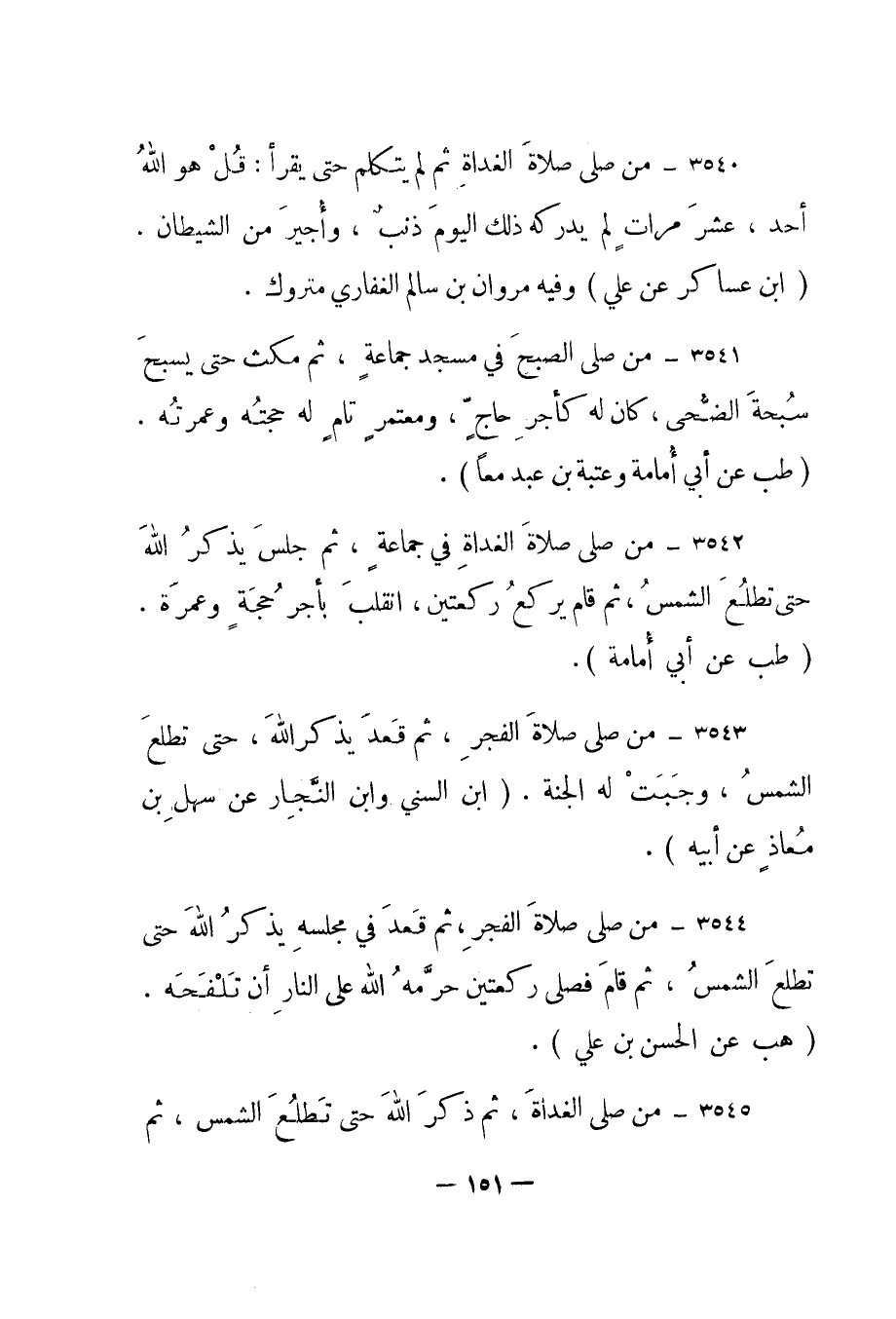 3543- "من صلى صلاة الفجر، ثم قعد يذكر الله، حتى تطلع الشمس، وجبت له الجنة". "ابن السني وابن النجار عن سهل بن معاذ عن أبيه".