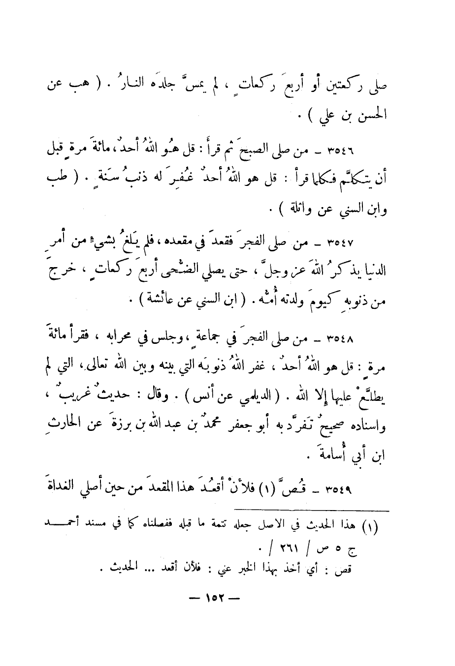 3546- "من صلى الصبح ثم قرأ: قل هو الله أحد، مائة مرة قبل أن يتكلم فكلما قرأ: قل هو الله أحد غفر له ذنب سنة". "طب وابن السني عن واثلة".