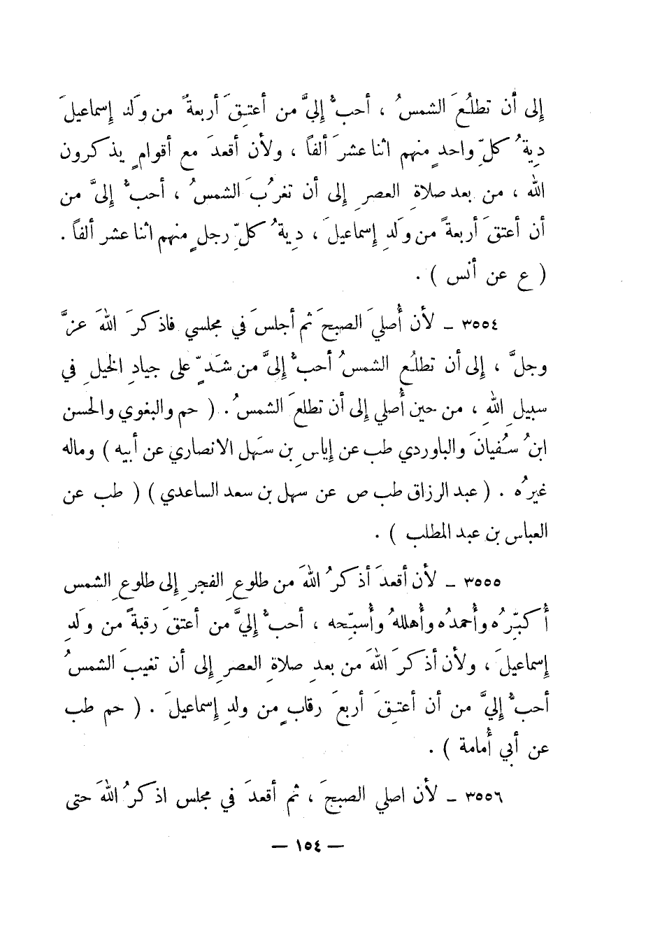 3555- "لأن أقعد أذكر الله من طلوع الفجر إلى طلوع الشمس أكبره وأحمده وأهلله وأسبحه، أحب إلي من أن أعتق رقبة من ولد إسماعيل، ولأن أذكر الله من بعد صلاة العصر إلى أن تغيب الشمس أحب إلي من أن أعتق أربع رقاب من ولد إسماعيل". "حم طب عن أبي أمامة".