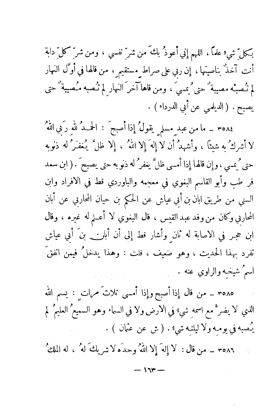 3584- "ما من عبد مسلم يقول إذا أصبح: الحمد لله ربي الله لا أشرك به شيئا، وأشهد أن لا إله إلا الله، إلا ظل يغفر له ذنوبه حتى يمسي، وإن قالها إذا أمسى ظل يغفر له ذنوبه حتى يصبح". "ابن سعد فر طب وأبو القاسم البغوي في معجمه والباوردي قط في الأفراد وابن السني من طريق أبان بن أبي عياش عن الحكم بن حيان المحاربي عن أبان المحاربي وكان من وفد عبد القيس، قال البغوي لا أعلم له غيره، وقال ابن حجر في الاصابة له ثان وأشار قط إلى أن أبان بن أبي عياش تفرد بهذا الحديث، وهو ضعيف، قلت: وهذا يدخل فيمن اتفق اسم شيخه والراوي عنه".