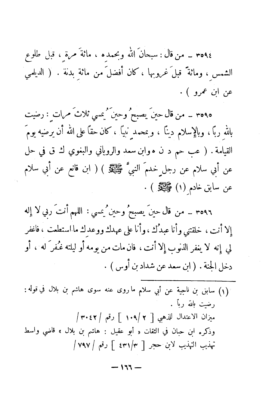 3595- "من قال حين يصبح وحين يمسي ثلاث مرات: رضيت بالله ربا، وبالإسلام دينا، وبمحمد نبيا، كان حقا على الله أن يرضيه يوم القيامة". "عب حم د ن هـ وابن سعد والروياني والبغوي ك ق في حل