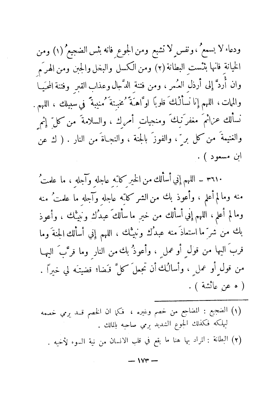 3610- "اللهم إني أسألك من الخير كله عاجله وآجله، ما علمت منه وما لم أعلم، وأعوذ بك من الشر كله عاجله وآجله ما علمت منه وما لم أعلم، اللهم إني أسألك من خير ما سألك عبدك ونبيك، وأعوذ بك من شر ما استعاذ منه عبدك ونبيك، اللهم إني أسألك الجنة وما قرب إليها من قول أو عمل، وأعوذ بك من النار وما قرب إليها من قول أو عمل، وأسألك أن تجعل كل قضاء قضيته لي خيرا". "هـ عن عائشة".